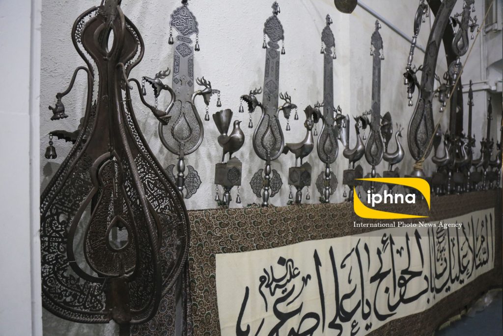 این ابزار آلات شامل وسایل و آثار تعزیه و شبیه خوانی مانند زره و کلاه خود، جوشن و زره، خنجر و شمشیر، ابزار عزاداری به شیوه زنجیرزنجی شامل زنجیر های فولادی با دسته فلزی و استخوانی، آثار نمادین عزاداری امام حسین علیه السلام مانند گهواره حضرت علی اصغر علیه اسلام از جنس نقره ، قطعات  هودج قدیمی مربوط آیین نخل گردانی از جنس چوب مربوط به دوره صفوی، علم های بزرگ عزاداری، توق‌ها و سرتوق‌های عزاداری از دوره صفوی، پرچم‌های عزاداری و پارچه‌های کتیبه‌دار  سیاه پوشی مجالس سوگواری حسینی، وسایل روشنایی مجالس روضه امام حسین علیه السلام از جمله شمعدان‌ها، وسایل پذیرایی از عزاداران مجالس حسینی حرم مطهر از جمله سماور‌ها و کتری و سینی و وسایل اطعام عزاداران وقفی مجالس روضه در عصر صفویه و قاجار، وسایل سقایی در مجالس و دسته جات عزاداری از جمله ظرف های آب خوری و کاسه‌های حرزدار عصر قاجار و وسایل معطرسازی مجالس عزاداری از جمله بخور سوزها و اسفند دودکن‌های عصر صفوی می شوند.